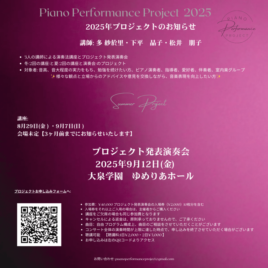 Posted on November 14, 2024February 15, 2025 by Saori OhnoPiano Performance Project 2025 Share this: Click to share on Bluesky (Opens in new window) Bluesky Like Loading...